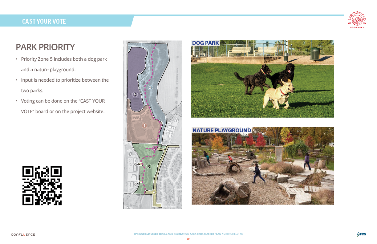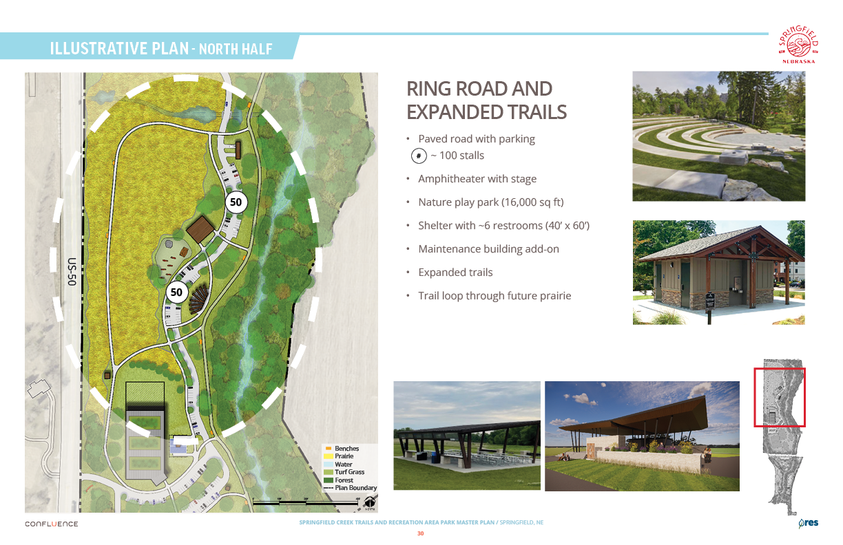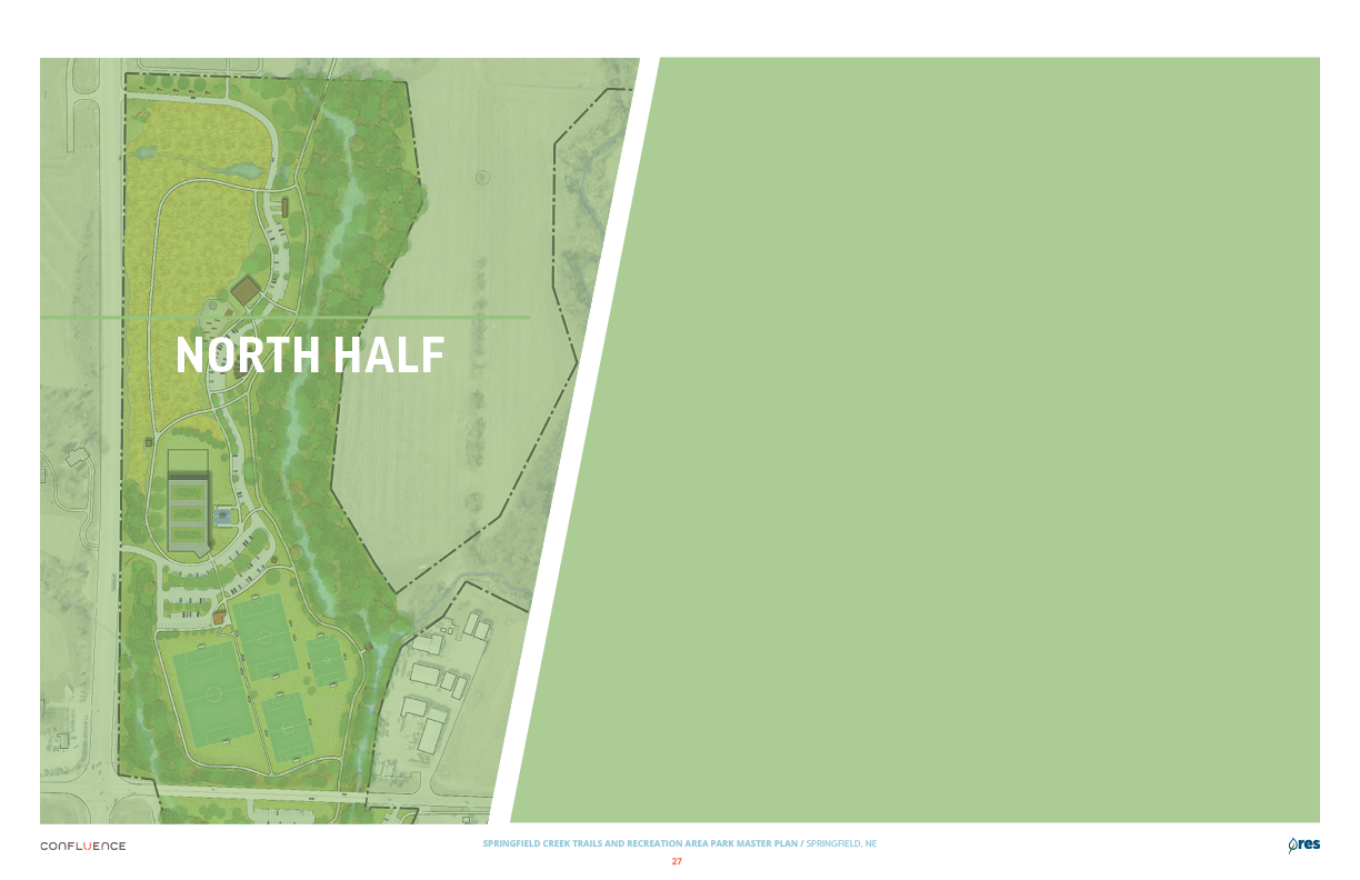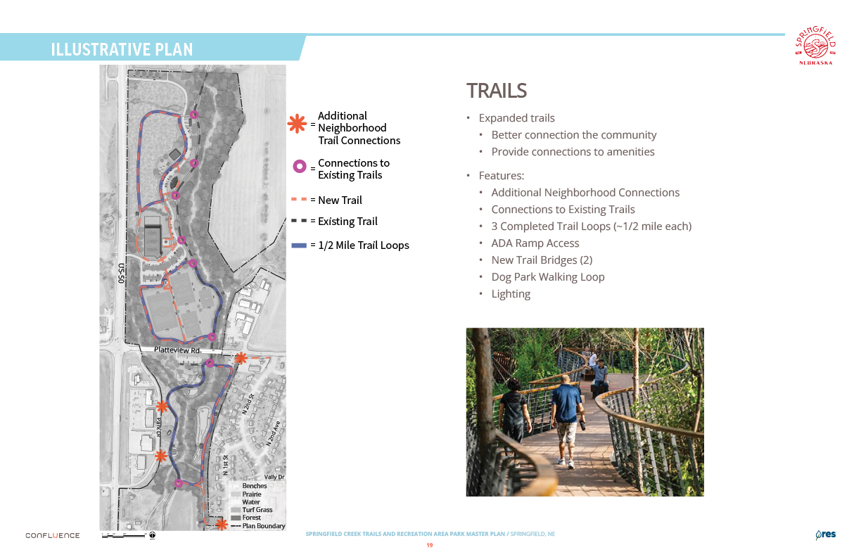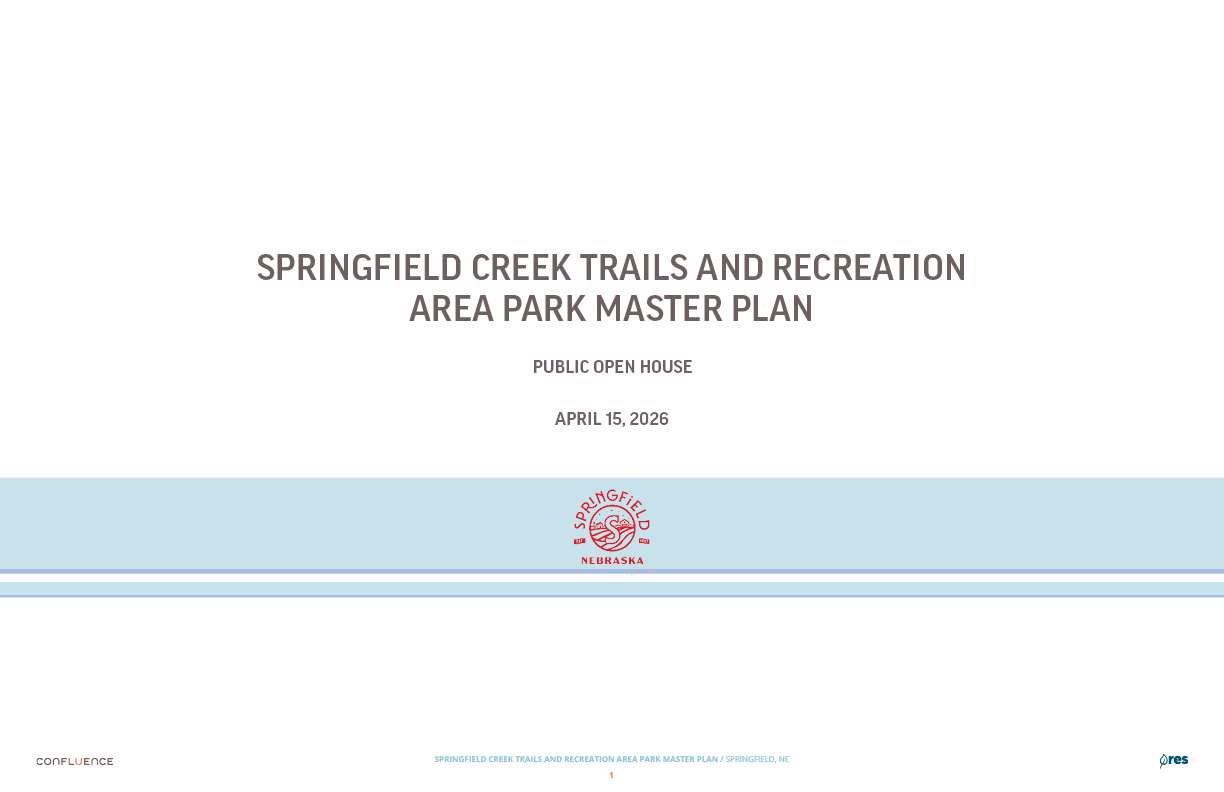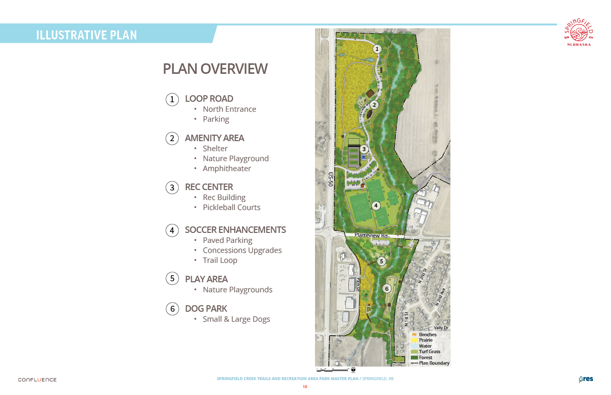 Welcome! The Springfield Creek Trails and Recreation Area offers residents many opportunities to enjoy both active and passive recreation. Over the past several months, the City has partnered with landscape architecture and planning firm Confluence to translate community ideas into a draft Master Plan, following extensive visioning and concept iterations with the steering committee and the public.