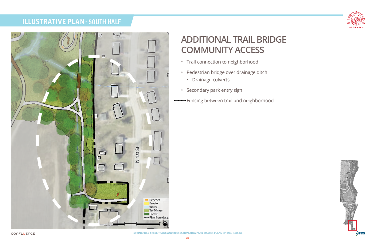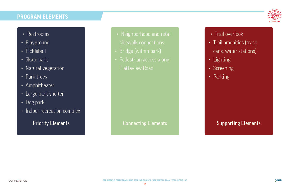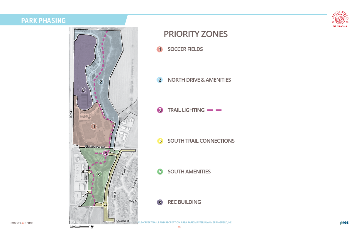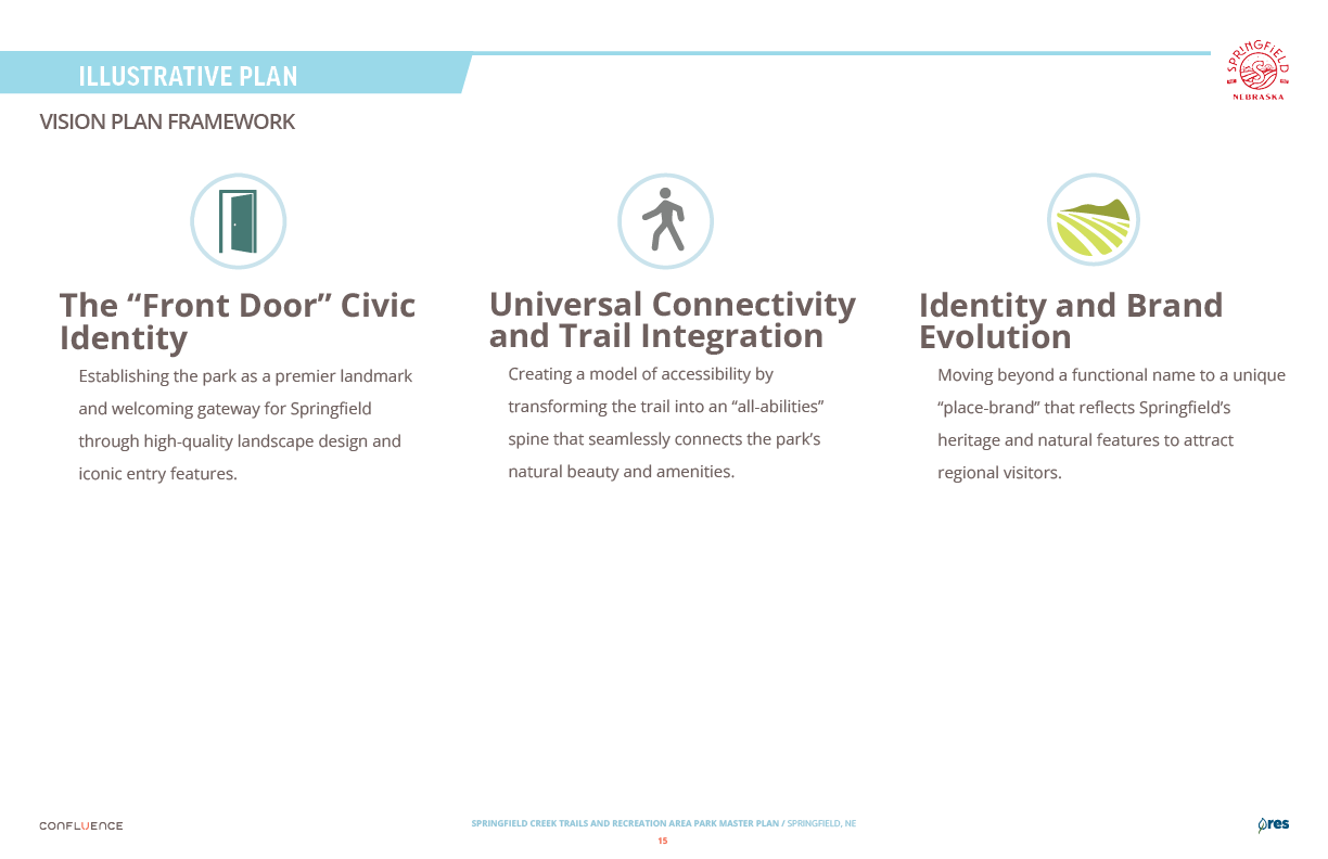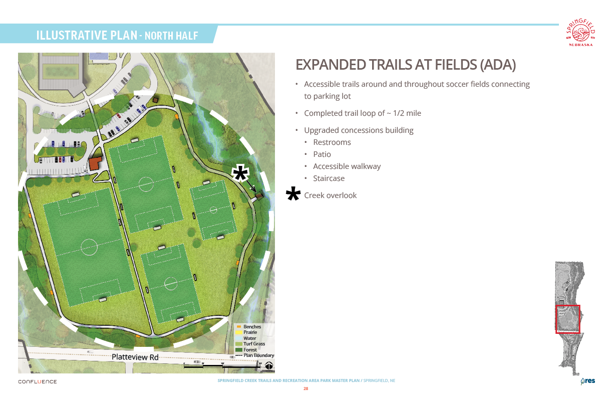 Welcome! The Springfield Creek Trails and Recreation Area offers residents many opportunities to enjoy both active and passive recreation. Over the past several months, the City has partnered with landscape architecture and planning firm Confluence to translate community ideas into a draft Master Plan, following extensive visioning and concept iterations with the steering committee and the public.