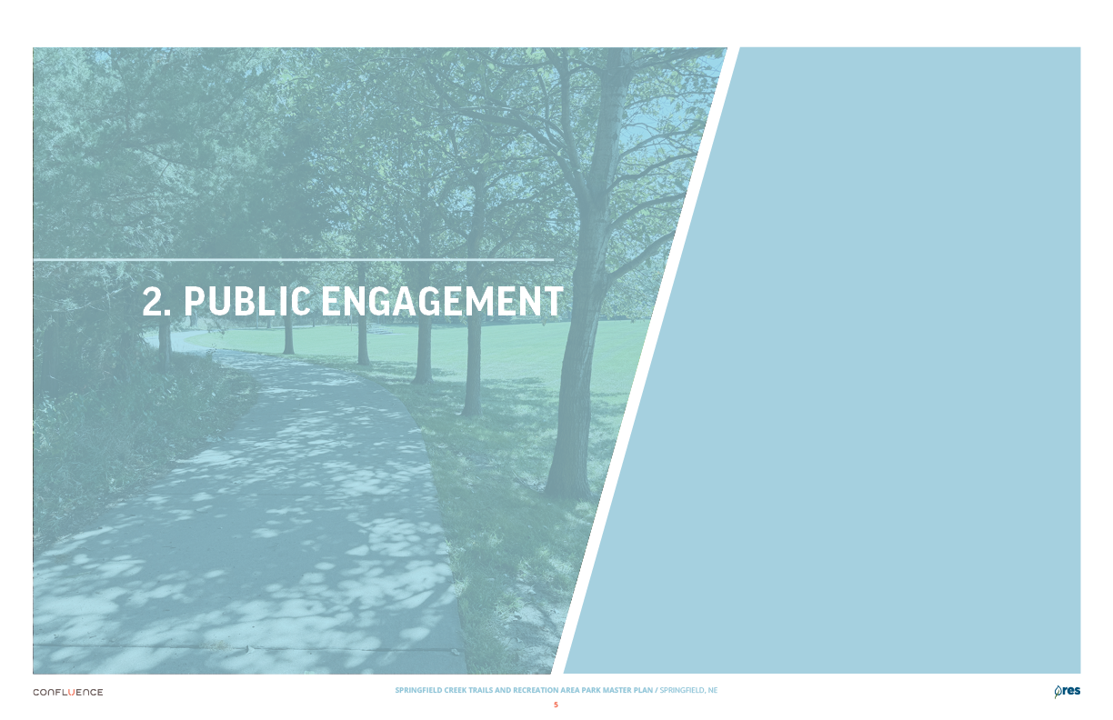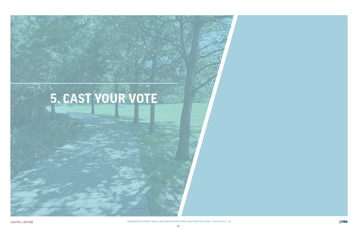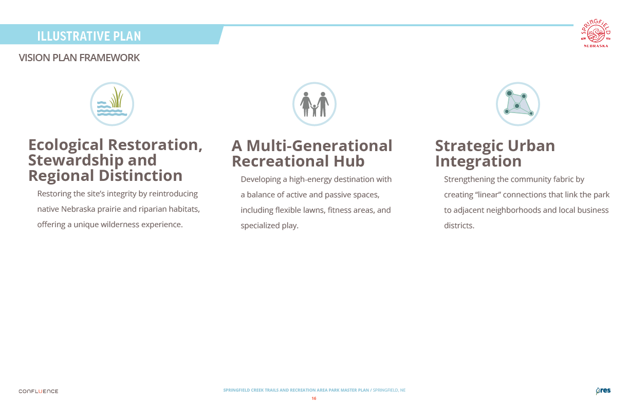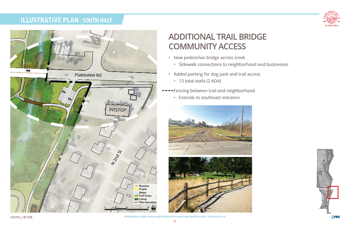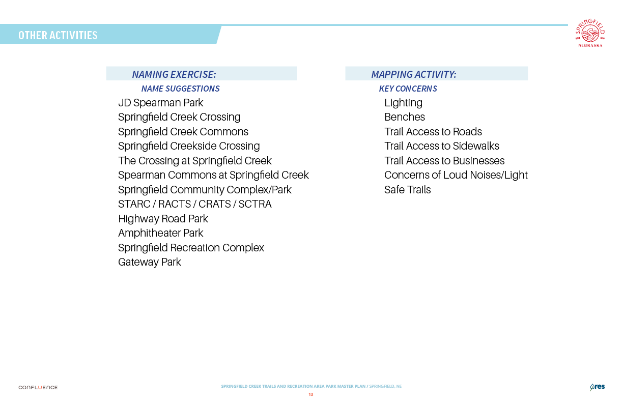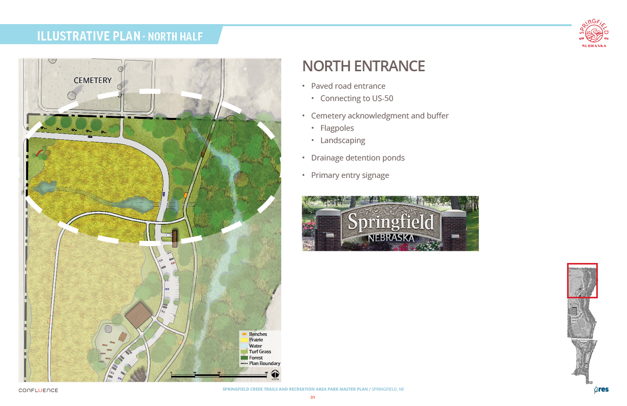 Welcome! The Springfield Creek Trails and Recreation Area offers residents many opportunities to enjoy both active and passive recreation. Over the past several months, the City has partnered with landscape architecture and planning firm Confluence to translate community ideas into a draft Master Plan, following extensive visioning and concept iterations with the steering committee and the public.