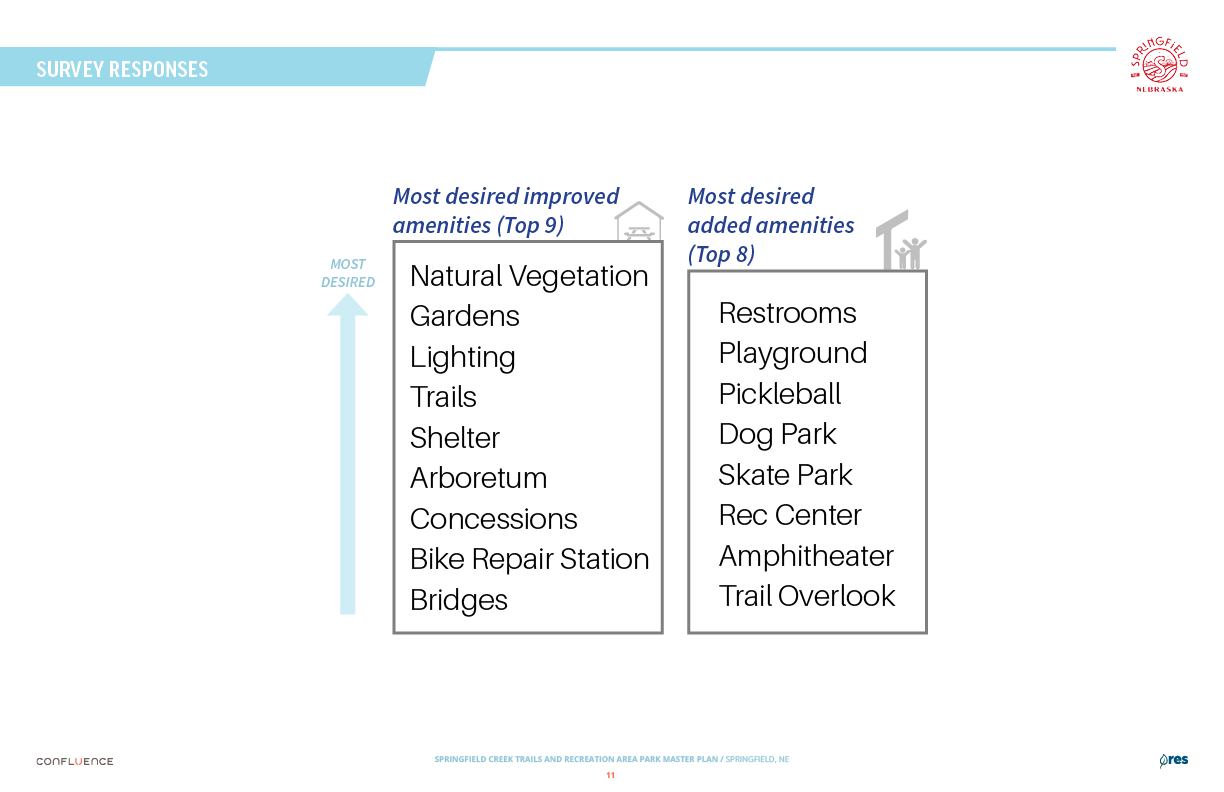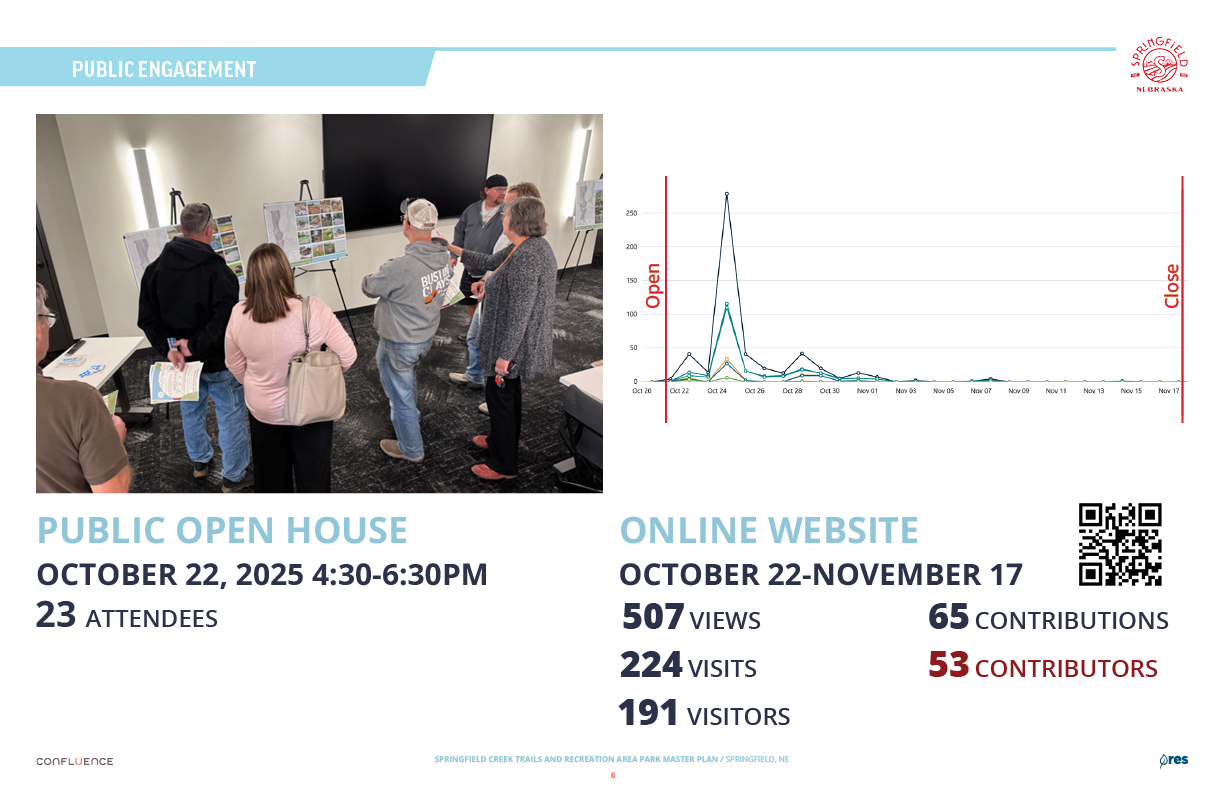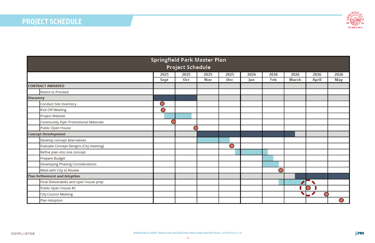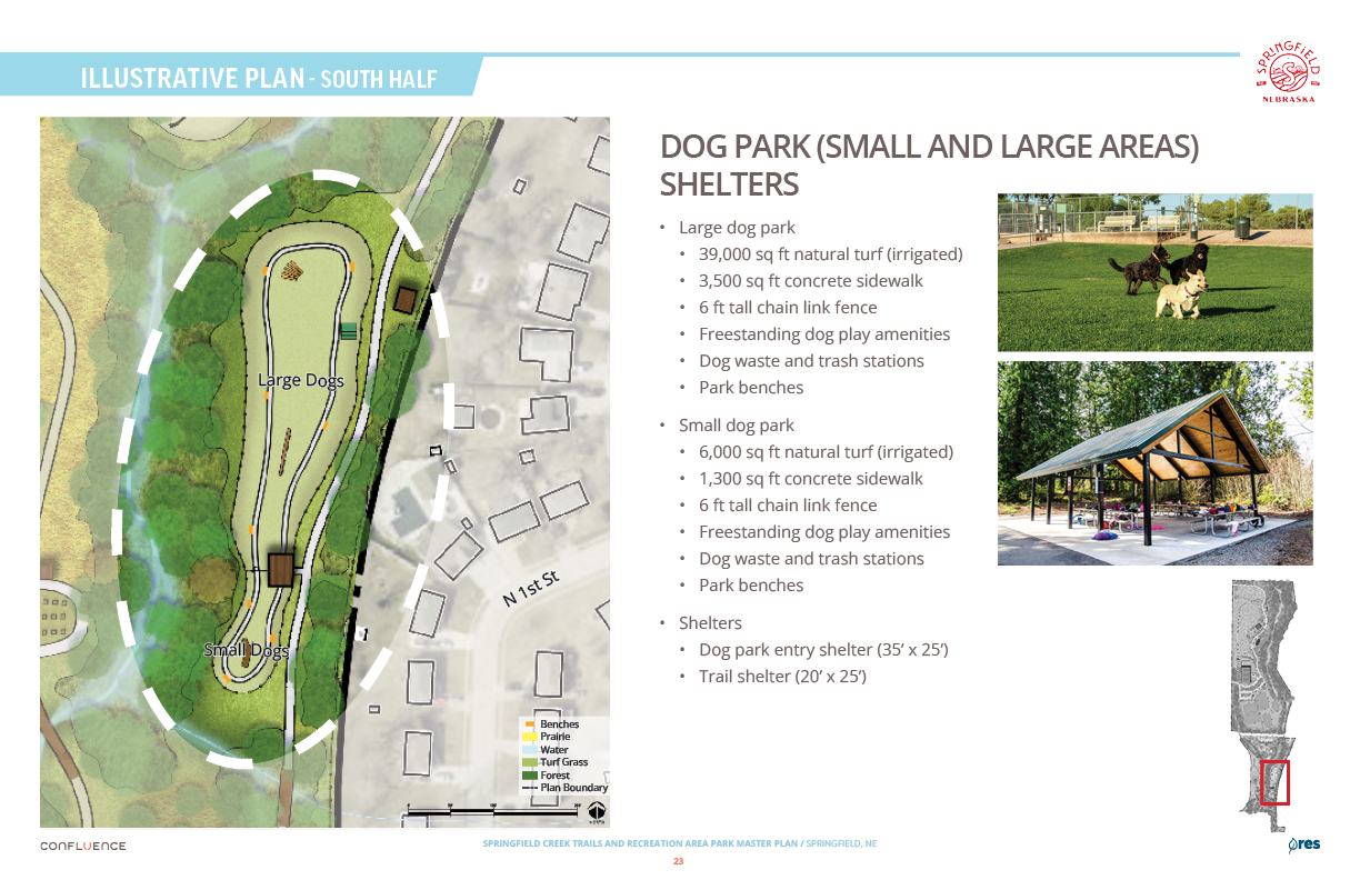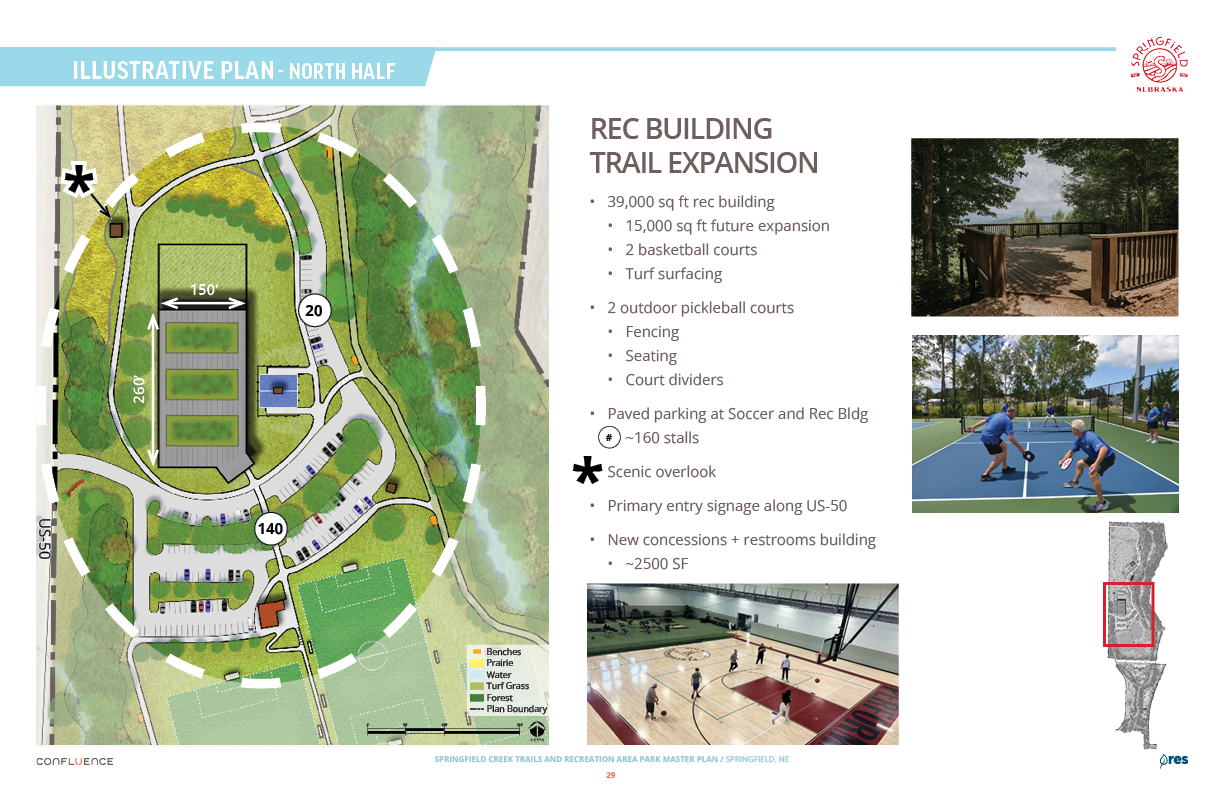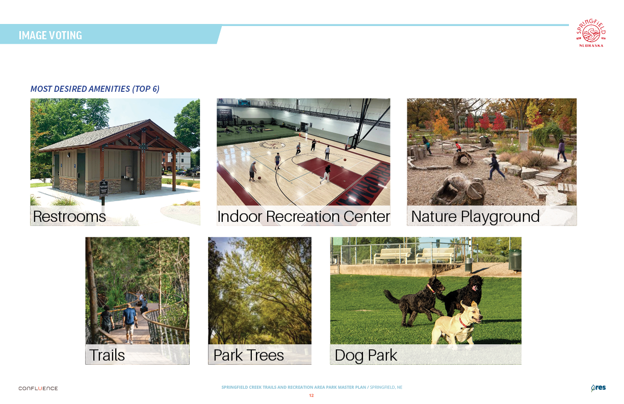 Welcome! The Springfield Creek Trails and Recreation Area offers residents many opportunities to enjoy both active and passive recreation. Over the past several months, the City has partnered with landscape architecture and planning firm Confluence to translate community ideas into a draft Master Plan, following extensive visioning and concept iterations with the steering committee and the public.